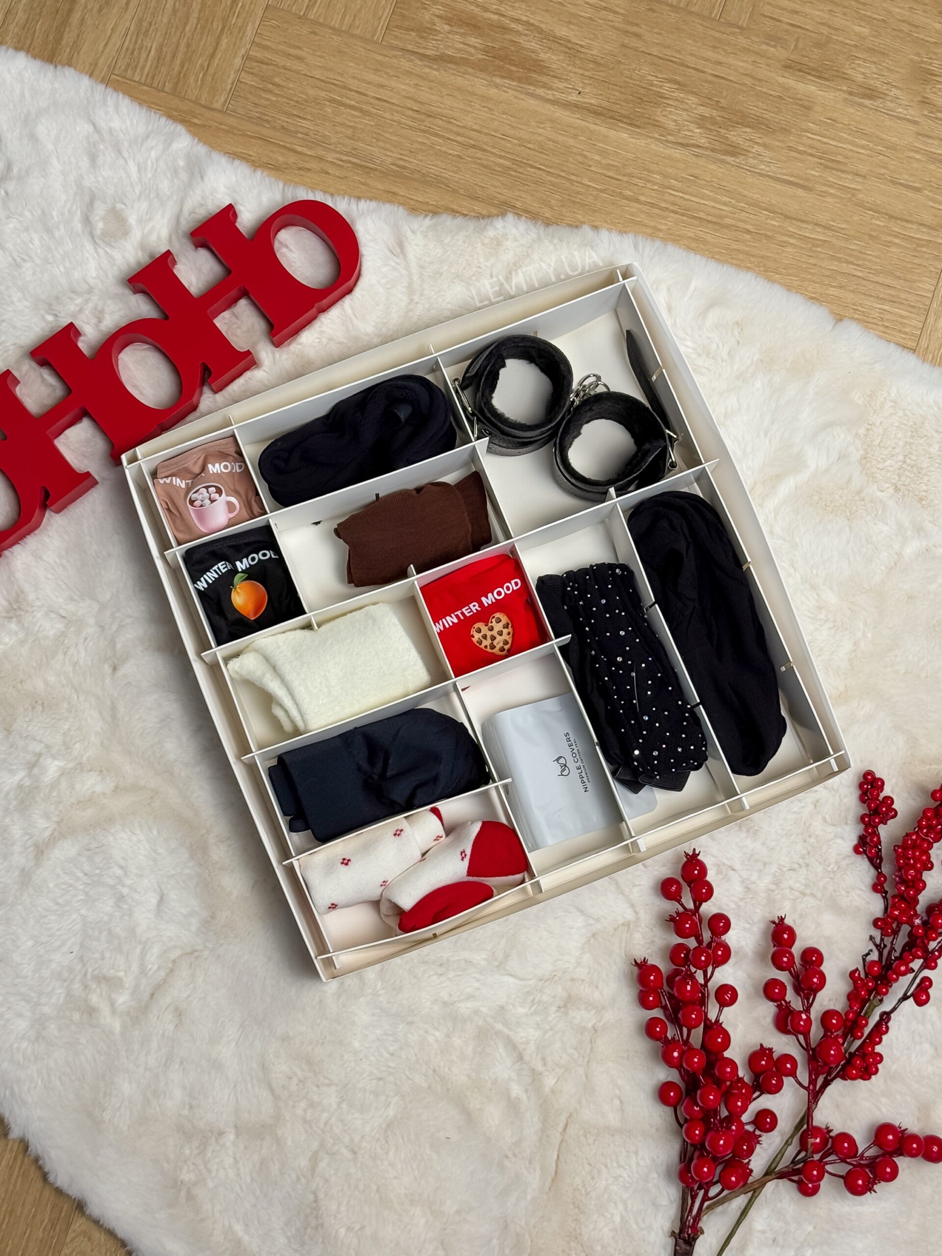 12 комірок, і в кожній різний елемент білизни і не тільки: